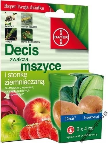 „Decis Ogród 015 EW to owadobójczy środek ochrony roślin, przeznaczony do zwalczania owadów w uprawach sadowniczych, warzywnych i roślin ozdobnych. Środek w formie koncentratu do rozrobienia z wodą oraz nanoszenia przy użyciu samobieżnych lub ciągnikowych opryskiwaczy polowych, opryskiwaczy sadowniczych oraz opryskiwaczy ręcznych. Przeznaczony do zwalczania stonki ziemniaczanej w uprawie ziemniaka i pomidora, kwieciaka jabłkowca na jabłoni, kwieciaka malinowca na truskawce, bielinka kapustnika i bielinka rzepnika na kapuście białej skoczka melisowego na uprawianej pod osłonami kocimiętce faassena, porazika kocankowego na uprawianym w gruncie astrze chińskim, mszyc i skoczka różanego na uprawianych w gruncie różach oraz w szkółkach roślin ozdobnych. Na roślinach działa powierzchniowo, Decis Ogród 015 EW to nowy preparat o nowej formulacji – olej w wodzie, co bardzo korzystnie zmienia profil ekotoksykologiczny preparatu w porównaniu do innych pyretroidów. Dzięki maleńkim kropelkom środek doskonale pokrywa powierzchnie roślin, jak również korpusy owadów. Zwiększona jest również odporność na zmywanie.KORZYŚCI:- łatwe odmierzanie oraz niższa w stosunku do innych pyretroidów szkodliwość- zwiększona odporność na zmywanie- formulacja na bazie wody, bardzo obniża ryzyko stosowania dla użytkownika i środowiska- nie działa drażniąco na skórę i drogi oddechowe- nie jest łatwopalny.- szybki efekt działania- nie uszkadza roślin- zwalcza ssące i gryzące szkodnikiCZAS STOSOWANIA:Optymalny zabieg: kwiecień, maj, czerwiec, lipiec, sierpieńMożliwy zabieg: wrzesieńSTOSOWANIE ŚRODKA:Ziemniak – Larwy i chrząszcze stonki ziemniaczanejMaksymalna dawka dla jednorazowego zastosowania: 0,5 l/ha.Zalecana dawka dla jednorazowego zastosowania: 0,4 – 0,5 l/ha.Wyższą z zalecanych dawek stosować do zwalczania chrząszczy oraz w przypadku bujnej naci ziemniaczanej.Termin stosowania: Opryskiwać po wystąpieniu szkodnika.Maksymalna liczba zabiegów w sezonie wegetacyjnym: 1.Zalecana ilość wody: 150-400 l/ha.Zalecane opryskiwanie: średniokropliste.Jabłoń – Kwieciak jabłkowiecMaksymalna / zalecana dawka dla jednorazowego zastosowania: 0,75 l/ha.Termin stosowania: Opryskiwać tuż przed pękaniem lub w czasie pękania pąków kwiatowych jabłoni. Zabieg wykonywać w dni słoneczne przy temperaturze co najmniej 12°C.Maksymalna liczba zabiegów w sezonie wegetacyjnym: 2.Odstęp pomiędzy zabiegami: co najmniej 14 dni.Zalecana ilość wody: 700 l/ha.Zalecane opryskiwanie: średniokropliste.Truskawka Kwieciak malinowiecMaksymalna dawka dla jednorazowego zastosowania: 0,8 l/ha.Zalecana dawka dla jednorazowego zastosowania: 0,6 – 0,8 l/ha.Środek wykazuje średni poziom zwalczania.Termin stosowania: Opryskiwać bezpośrednio po zaobserwowaniu szkodnika.Maksymalna liczba zabiegów w sezonie wegetacyjnym: 2.Odstęp pomiędzy zabiegami: co najmniej 14 dni.Zalecana ilość wody: 700 l/ha.Zalecane opryskiwanie: średniokropliste.Kapusta głowiasta biała (uprawa polowa) – Bielinek kapustnik, bielinek rzepnikMaksymalna dawka dla jednorazowego zastosowania: 0,5 l/ha.Zalecana dawka dla jednorazowego zastosowania: 0,4 – 0,5 l/ha.Termin stosowania: Opryskiwać bezpośrednio po zaobserwowaniu gąsienic motyli.Maksymalna liczba zabiegów w sezonie wegetacyjnym: 2.Odstęp pomiędzy zabiegami: co najmniej 14 dni.Zalecana ilość wody: 600 l/ha.Zalecane opryskiwanie: średniokropliste.Pomidor – Stonka ziemniaczanaMaksymalna dawka dla jednorazowego zastosowania: 0,5 l/haZalecana dawka dla jednorazowego zastosowania: 0,4 – 0,5 l/haTermin stosowania: Opryskiwać bezpośrednio po zaobserwowaniu pierwszych larw stonki ziemniaczanej.Maksymalna liczba zabiegów w sezonie wegetacyjnym: 1.Zalecana ilość wody: 600 l/ha.Zalecane opryskiwanie: średniokropliste.Kocimiętka faassena (w uprawie pod osłonami) – Skoczek melisowyMaksymalne / zalecane stężenie dla jednorazowego zastosowania: 0,075% (7,5 ml środka w 10 l wody).Termin stosowania: Opryskiwać po wystąpieniu szkodnika.Maksymalna liczba zabiegów w sezonie wegetacyjnym: 2.Odstęp pomiędzy zabiegami: co najmniej 14 dni.Zalecana ilość cieczy użytkowej: 7 l/ 100 m2Zalecane opryskiwanie: średniokropliste.Aster chiński (w uprawie polowej)- Porazik kocankowyMaksymalne/ zalecane stężenie dla jednorazowego zastosowania: 0,075% (7,5 ml środka w 10 l wody).Termin stosowania: Opryskiwać po wystąpieniu szkodnika.Maksymalna liczba zabiegów w sezonie wegetacyjnym: 2.Odstęp pomiędzy zabiegami: co najmniej 14 dni.Zalecana ilość cieczy użytkowej: 10 l/ 100 m2Zalecane opryskiwanie: średniokropliste.Róża (w uprawie polowej) – Mszyce, skoczek różanyMaksymalne / zalecane stężenie dla jednorazowego zastosowania: 0,075% (7,5 ml środka w 10 l wody).Termin stosowania: Opryskiwać po wystąpieniu szkodnika.Maksymalna liczba zabiegów w sezonie wegetacyjnym: 2.Odstęp pomiędzy zabiegami: co najmniej 14 dni.Zalecana ilość cieczy użytkowej: 7 l/ 100 m2Zalecane opryskiwanie: średniokropliste.INFORMACJE O REJESTRACJI:Zarejestrowana nazwa: Decis Ogród 015 EWNumer rejestracji: MRiRW nr R-743/2015d z dnia 04.09.2015 r.Ze środków ochrony roślin należy korzystać z zachowaniem bezpieczeństwa. Przed każdym użyciem przeczytaj informacje zamieszczone na etykiecie i informacje dotyczące produktu. Zwróć uwagę na zwroty wskazujące na rodzaj zagrożenia oraz przestrzegaj zalecanych środków bezpieczeństwa.”