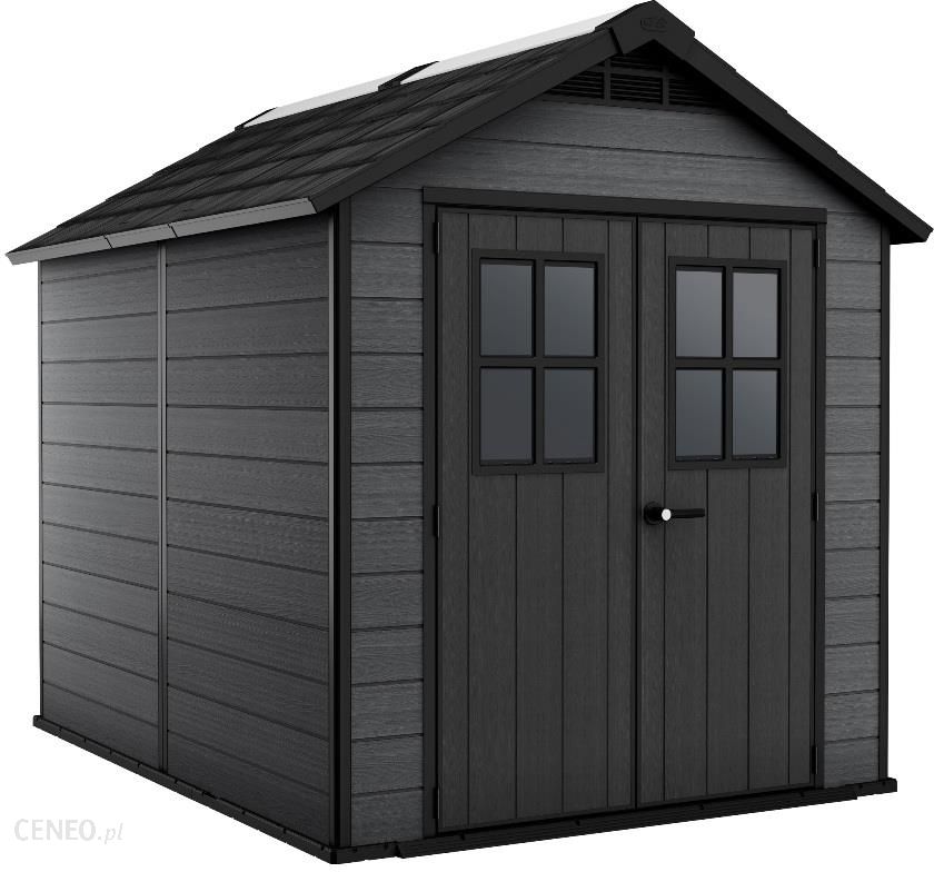 Keter Domek ogrodowy Newton 759 szary Przenośny domek narzędziowy Keter to uniwersalne i kompleksowe rozwiązanie do ogrodu i podwórka. Nadaje się do przechowywania narzędzi ogrodowych, mebli ogrodowych, grilli, zabawek, rowerów oraz innych akcesoriów ogrodowych. Wysokiej klasy tworzywo sztuczne, z którego został wykonany domek, zapewni dużą wytrzymałością i odpornością. W 100% wodoodporny oraz odporny na promieniowanie UV, dzięki czemu zachowa swoje kolory na lata.Praktycznie bezobsługowy, nie wymaga żadnych zabiegów impregnacyjnych (malowania, lakierowania itd.). Łatwe czyszczenie, wystarczy zwykła myjka ogrodowa i woda, można stosować łagodne środki czyszczące. Szerokie, podwójne drzwi dają łatwy dostęp do przechowywanych narzędzi. Okno oraz świetlik na całej długości kalenicy zapewniają odpowiednią ilość naturalnego światła. Wmontowane otwory wentylacyjne zapewnia cyrkulację powietrza chroniącą przechowywane przedmioty przed działaniem wilgoci. Wytrzymała (znosi obciążenia 150kg/m²) podłoga chroni wnętrze przed wodą, śniegiem, błotem i gryzioniami. Oferowany model domku to rozwiązanie całoroczne – nie trzeba go demontować wraz z zakończeniem sezonu letniego. Łatwy montaż, bez specjalnego przeszkolenia czy specjalistycznych narzędzi (dołączona bogata w ilustracje instrukcja montażu). Specyfikacja domku Keter Newton 759 Kolor: szary Wysokość: 252 cm; Szerokość: 228 cm; Głębokość 287 cm Wnętrze: Wysokość: 236 cm; Szerokość: 201 cm; Głębokość: 255 cm Szerokość drzwi cca: 139 x 182 cm Waga: 186,0 kg