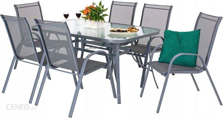 ZESTAW MEBLI OGRODOWYCHZESTAW MEBLI OGRODOWYCH idealny do Twojego ogrodu. Stelaż został podwójnie lakierowany proszkowo, co idealnie przystosowuje ten produkt to zastosowania wewnątrz jak i na zewnątrz. Siedzisko krzesła oraz oparcie zostało zrobione z szary-antracyt, elastycznego obicia tekstylnego tak, aby maksymalnie zwiększyć wygodę. Posiada ono dwa oparcia boczne. Użyte materiały nie wymagają częstej konserwacji, są odporne na warunki pogodowe i nie wymagają specjalnych środków do pielęgnacji. Nóżki są dodatkowo zaopatrzone w nakładki z tworzywa sztucznego. Stół posiada blat z przeźroczysto-ornamentowej hartowanej szyby o gr. 5 mm, z otworem na wstawienie parasola ogrodowego.Kolor stelażu: SZARY-ANTRACYTKolor obicia: SZARY-ANTRACYTDANE TECHNICZNE:liczba osób: 6,materiał konstrukcyjny: profile stalowe malowane proszkowo,pokrycie: siedziska i oparcia krzeseł wykonane z tkaniny texteline,kolor: konstrukcja szary-antracyt, pokrycie szary-antracyt,wymiary stołu (szer. x dł. x wys.) lub (średn. x wys.): 90 cm x 150 cm x 73 cm,blat stołu / stolika: szkło hartowane przeźroczysto-ornamentowe, gr. 5 mm,otwór w blacie na parasol (średnica): 50 mm,wymiary krzesła (szer. x gł. x wys.): 54 cm x 67 cm x 97 cm,szerokość wewn. siedziska: 46 cm,głębokość wewn. siedziska: 45 cm,wysokość siedziska: 43 cm,szerokość wewn. oparcia: 46 cm,wysokość wewn. oparcia: 60 cm,maksymalne obciążenie: ok. 130 kg (dot. krzesła),waga (bez opakowania): 46 kg,w komplecie: 6 krzeseł, stół, zestaw montażowy.UWAGA!!Zamówienie wysyłane jest w kliku przesyłkach ze względu na gabaryty.