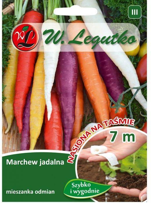 Mieszanka marchwi o korzeniach barwy białej, kremowej, żółtej, pomarańczowej i fioletowej. Korzenie gładkie o cylindrycznym lub stożkowatym kształcie. Doskonale nadają się do kolorystycznego i smakowego wzbogacenia potraw. Taśmy wykładać od kwietnia do czerwca, wprost do gruntu w rzędy 30 – 40 cm. i 3 – 5 cm. w rzędzie, głębokość siewu 1 – 2 cm. Lubi ziemię przepuszczalną, żyzną. Nasiona na taśmie zapewniają równomierne i szybkie wschody oraz ułatwiają uprawę roślin. Dzięki optymalnemu rozmieszczeniu nasion, nie ma konieczności wykonywania przerywki i rośliny rosną we właściwej rozstawie.Po rozłożeniu taśmy w gruncie i przykryciu ich warstwą ziemi należy je intensywnie podlać. Materiał z którego wykonane są taśmy, rozpuszcza się w glebie i jest przyjazny dla środowiska.Długość taśmy: 7 mPRODUKT POLSKIProducent: LEGUTKO