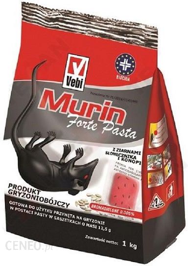 Najsilniejsza z dostępnych na rynku trutka w postaci pasty przeznaczona do zwalczania myszy i szczurów. Trutka w paście na myszy i szczury MURIN FACOUM FORTE posiada w składzie ziarna słonecznika oraz substancje wabiące, które skutecznie zachęcają szkodnika do spożycia. Dodatkową zaletą trutki ze słonecznikiem jest zawartość tłuszczów, które chronią ją przed działaniem wilgoci. Trutka mumifikująca na myszy i szczury została wyprodukowana w sposób, który zapobiega jej roznoszeniu przez owady. Środek do zwalczania myszy i szczurów w paście posiada związki mumifikujące, które wstrzymują proces krzepnięcia krwi u gryzonia. Trutka ma opóźnione działanie, dlatego gryzonie zaczynają padać po ok. 4-5 dniach od pierwszego spożycia. Całkowite wytępienie szkodników następuje po ok. 2 tygodniach. STOSOWANIE Trutkę w paście MURIN FACOUM FORTE należy wykładać w przeznaczonych do tego stacjach deratyzacyjnych w miejscach występowania gryzoni, a także w pobliżu ich kryjówek. W zależności od intensywności szkodników przypadku szczurów należy wykładać dawkę 25-50 g (2-4 saszetki) w odległości co ok. 10-15 m, natomiast na myszy 12-25 g (1-2 saszetki) co 3-5 m.