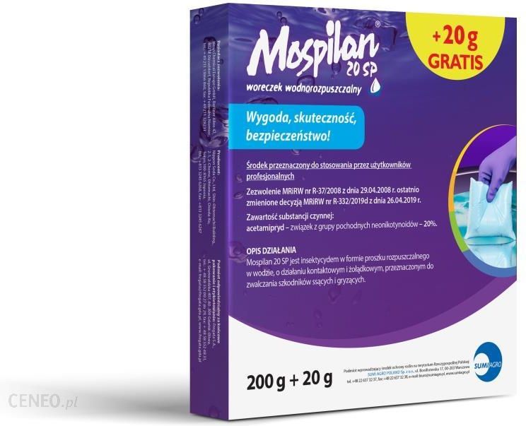 Mospilan 20SP jest środkiem owadobójczym w formie proszku rozpuszczalnego w wodzie, o działaniu kontaktowym i żołądkowym, przeznaczony do zwalczania szkodników ssących i gryzących w uprawie ziemniaka, roślinach sadowniczych, warzywnych, ozdobnych.Środek MOSPILAN 20 SP stosowany jest przy użyciu opryskiwaczy ręcznych. Na roślinie działa powierzchniowo, wgłębnie i systemicznie.Sporządzanie cieczy użytkowej:Przed przystąpieniem do sporządzania cieczy użytkowej dokładnie ustalić potrzebną jej ilość. Odważoną ilość środka wsypać do zbiornika opryskiwacza napełnionego częściowo wodą (z włączonym mieszadłem). Opróżnione opakowania przepłukać trzykrotnie wodą, a popłuczyny wlać do zbiornika opryskiwacza z cieczą użytkową. Zbiornik opryskiwacza uzupełnić wodą do potrzebnej ilości. Po wsypaniu środka do zbiornika opryskiwacza nie wyposażonego w mieszadło hydrauliczne ciecz w zbiorniku mechanicznie wymieszać. Po pracy aparaturę dokładnie wymyć czystą wodą.„Ze środków ochrony roślin należy korzystać z zachowaniem bezpieczeństwa. Przed każdym użyciem przeczytaj informacje zamieszczone w etykiecie i informacje dotyczące produktu. Należy zwrócić uwagę na szczegółowe wskazania dotyczące ryzyka. Należy stosować się do zasad bezpieczeństwa zawartych w etykiecie””W przypadku Produktów będących środkami ochrony roślin w rozumieniu ustawy o środkach ochrony roślin z dnia 8 marca 2013 r. (Dz.U. 2013 poz. 455 ze zm.) oraz rozporządzenia nr 1107/2009 (Dz.U. 2011 nr 284 poz. 1673 ze zm.), złożyć Zamówienie oraz być stroną Umowy Sprzedaży mogą jedynie Klienci będący osobami fizycznymi posiadającymi pełną zdolność do czynności prawnych oraz posiadającymi kwalifikacje wymagane od osób nabywających środki ochrony roślin określone w art. 28 ustawy o środkach ochrony roślin z dnia 8 marca 2013 r. (Dz.U. 2013 poz. 455 ze zm.).”